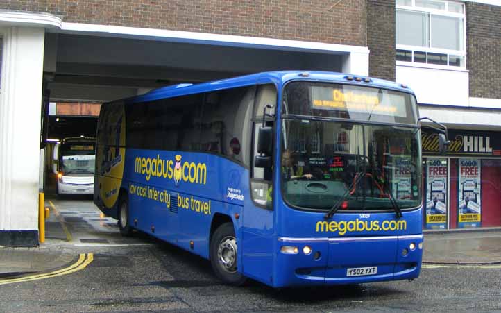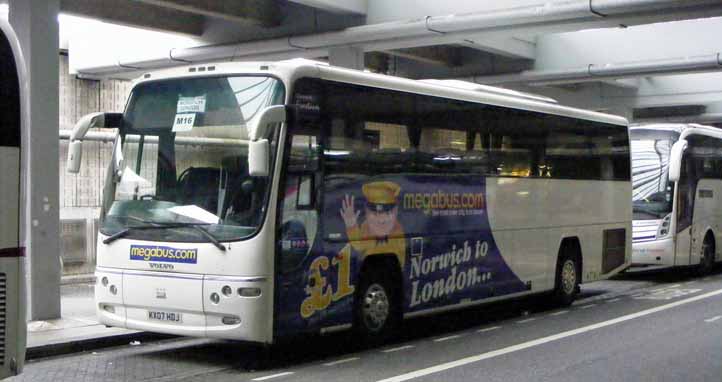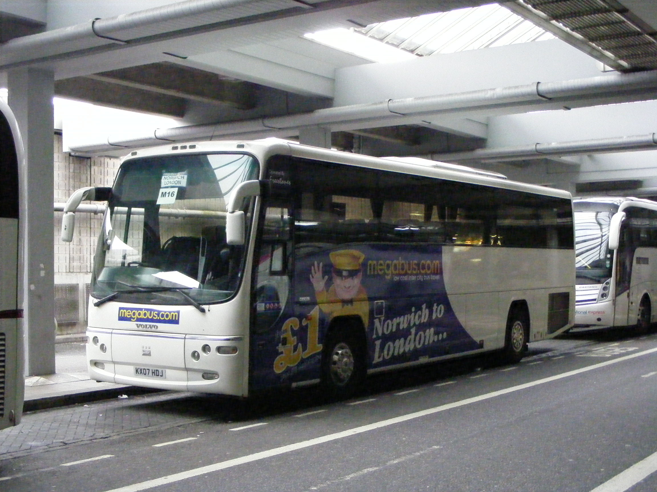 Megabus expanded into East Anglia with a franchised operation. In this instance Norwich based Freestones has partially painted Plaxton Panther bodied Volvo B12B KX07HDJ in Megabus livery. It is seen on layover in May 2012 in the former BOAC building opposite Victoria Coach Station. The coach has since been repainted in full Megabus livery. |