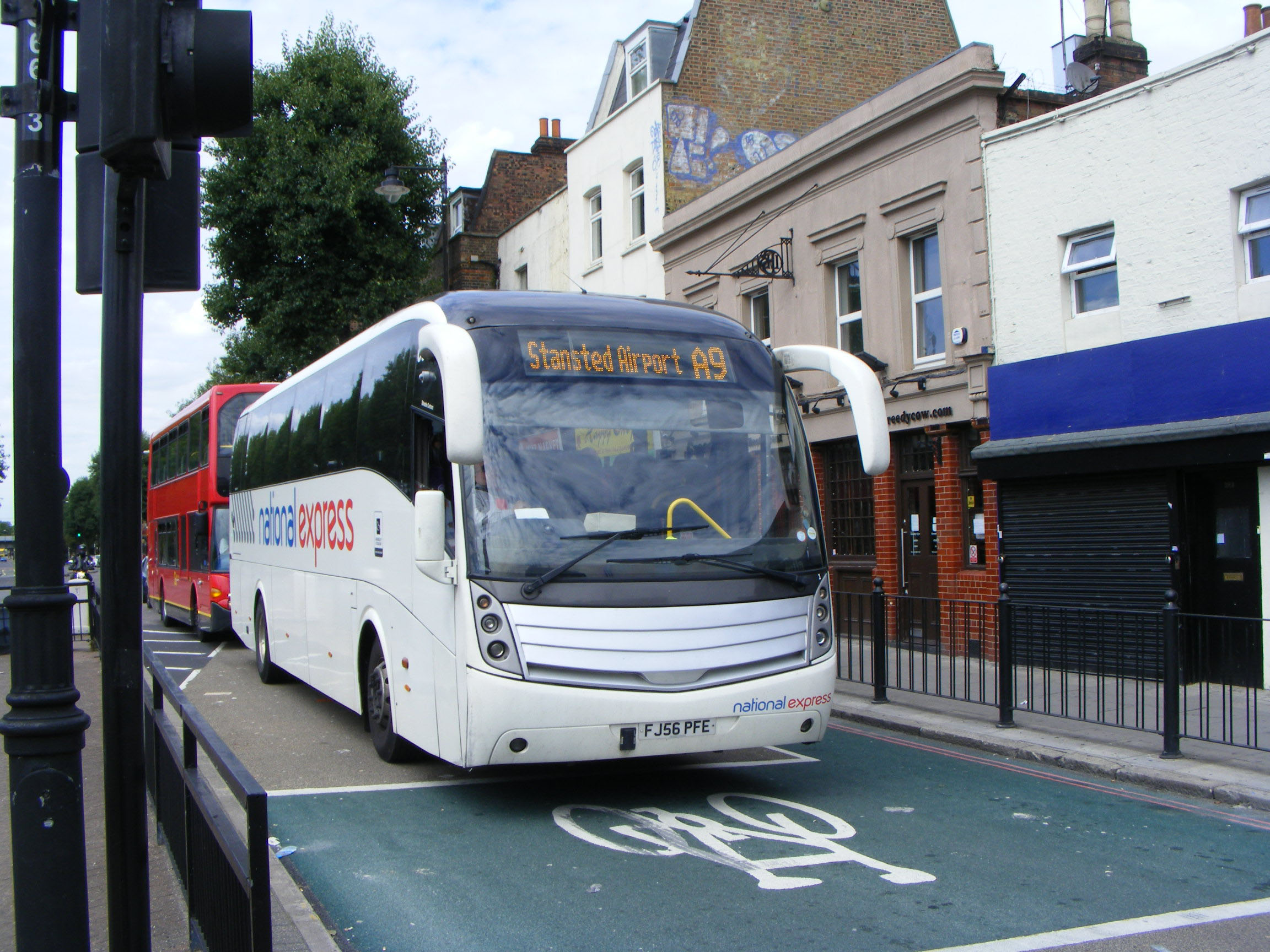 Renumbered from NXSC1 is Scania K340EB C001 (FJ56PFE) seen in London heading for Stansted on the A9 in July 2011.