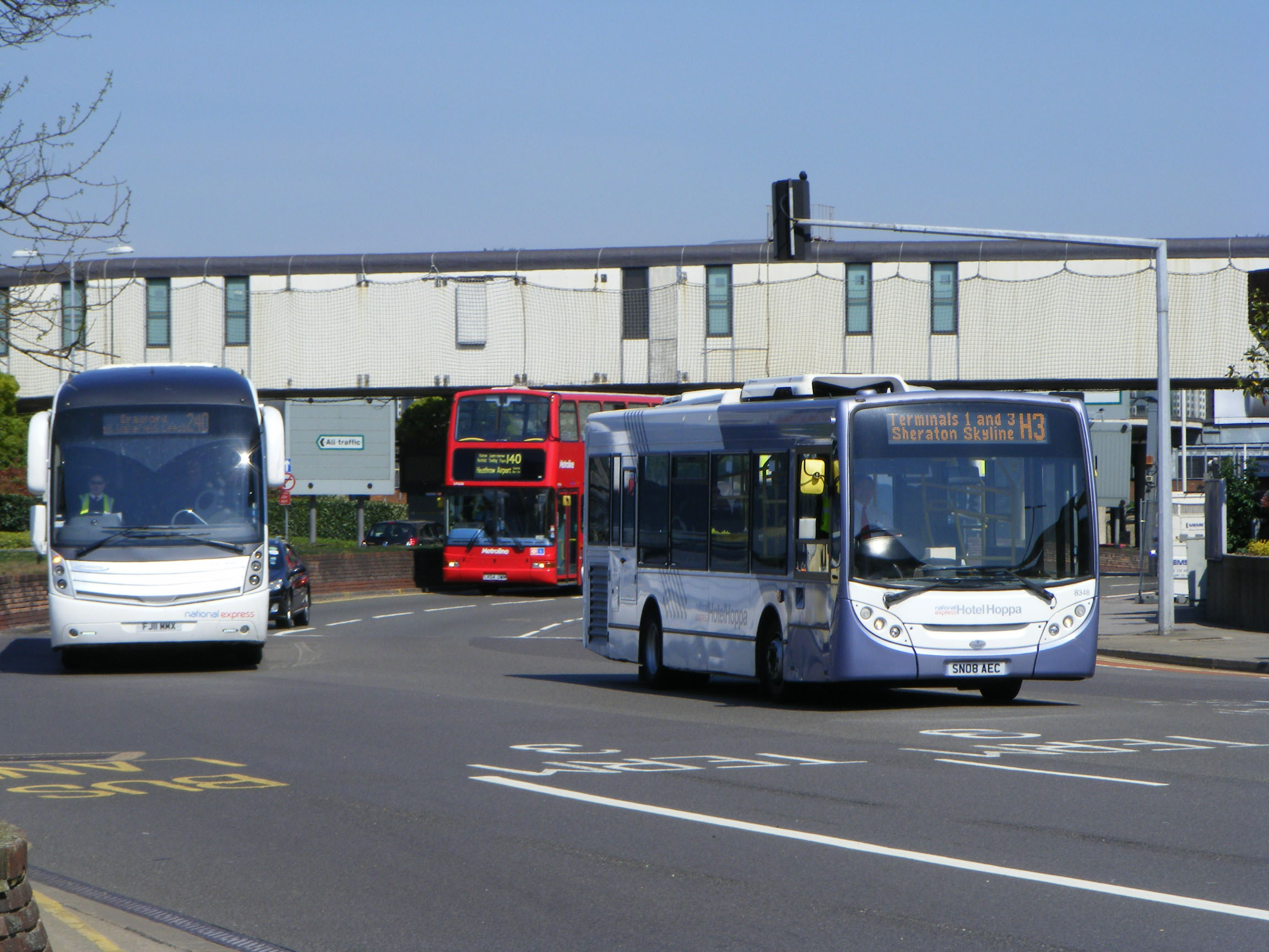 Arriving at Heathrow in May 2013 is Your Bus Volvo B9R, 4027 (FJ11MMX). On the right is one of the fleet of Alexander Dennis Enviro200 buses, 8348 (SN08AEC), used on what was National Express' Hotel Hoppa services that link the airport to neighbouring hotels. In the middle is a Metroline Plaxton President bodied Volvo B7TL, VP606 (LK04UWM). |