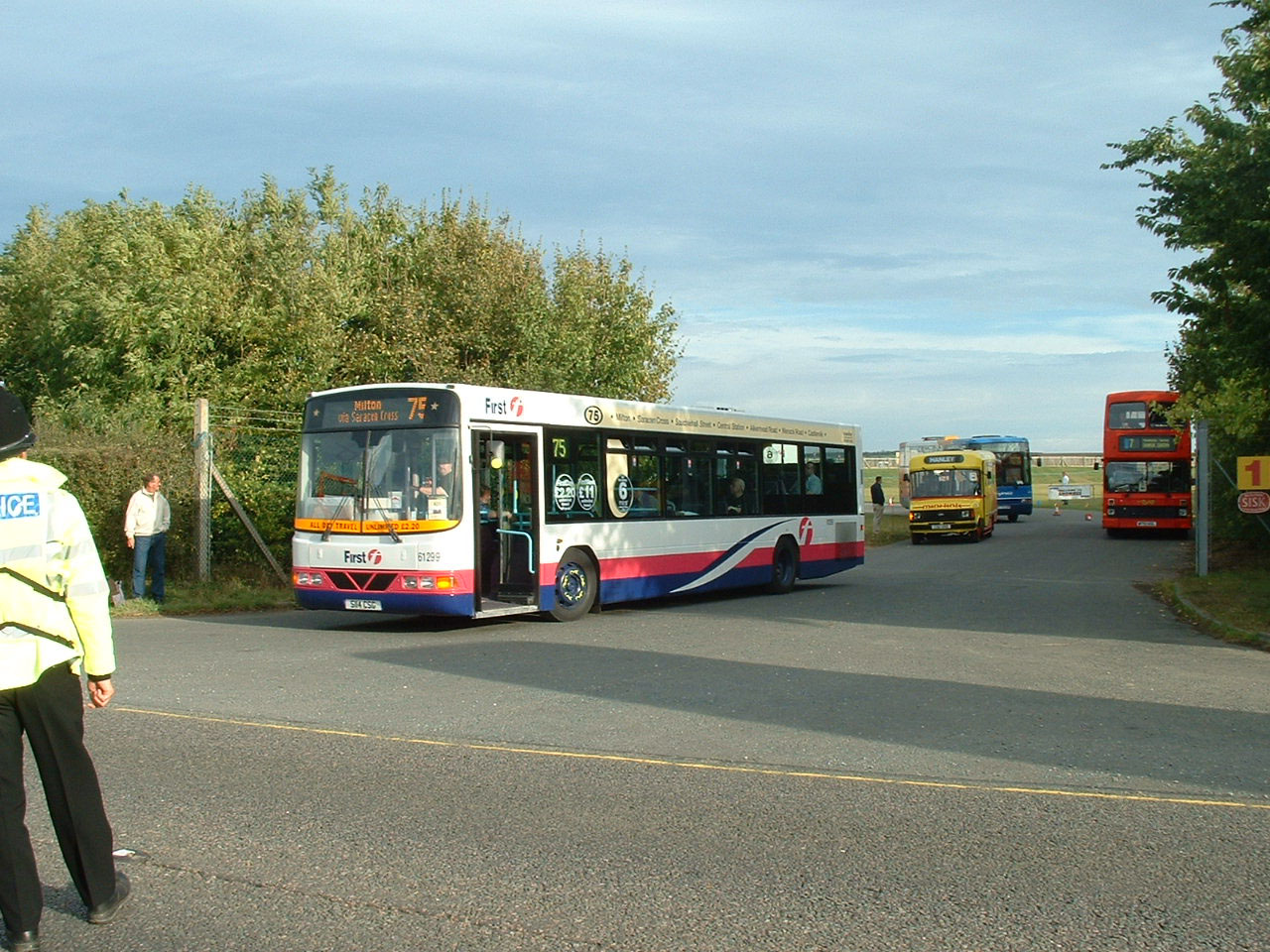 Leaving SHOWBUS is First Glasgow 61291 (S114CSG) Scania L94UB/Wright Access with obvious