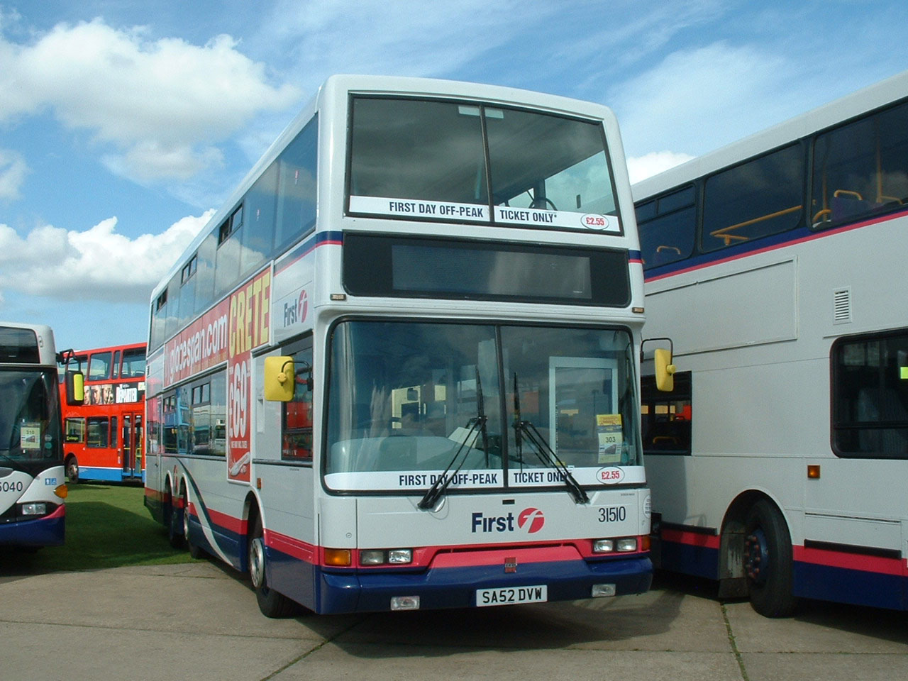 First Glasgow Volvo B7L Nordyc One of these jumbo deckers was expected at SHOWBUS last year but substituted by an Eclipse Gemini on the day. VT5 or 31510 (SA52DVW) is one of ten First Glasgow tri-axle Volvo B7Ls with East Lancs Nordyc 95 seat bodywork. It was also one of a dozen or more tri-axle deckers at SHOWBUS.