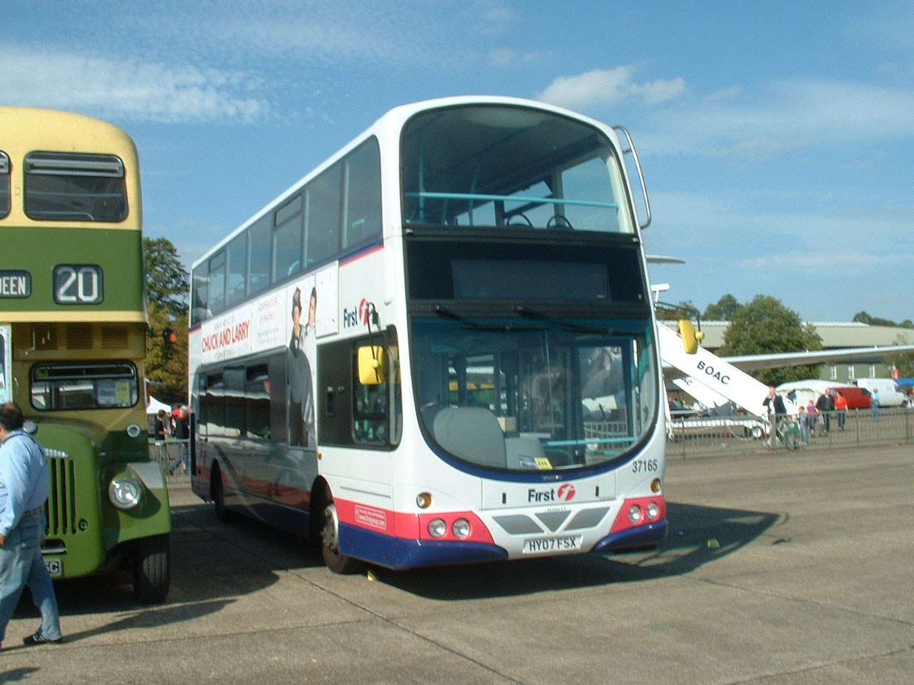 A striking contrast with the First Aberdeen heritage vehicle alongside (Alexander bodied Daimler CVG6 325) is the first doubledecker new to First Hampshire & Dorset for some years, one of five Volvo B7TLs with Wright Eclipse Gemini bodywork: 37165 (HY07FSX).