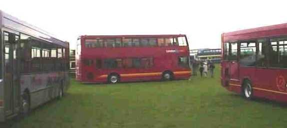 | Cambridge Coach Services has recently launched a doubledeck express coach service from its home town to Lowestoft with a fleet of Northern Counties bodied Olympians | In the Dennis display were 3 Dart SLFs, a Plaxton example in First colours, an Alexander one in Stagecoach colurs and a Wright model for Arriva - there's standardisation for you! | A mixture of coaches, nearest the camera an Ikarus Volvo of the recently liberated Countryliner of Guildford |