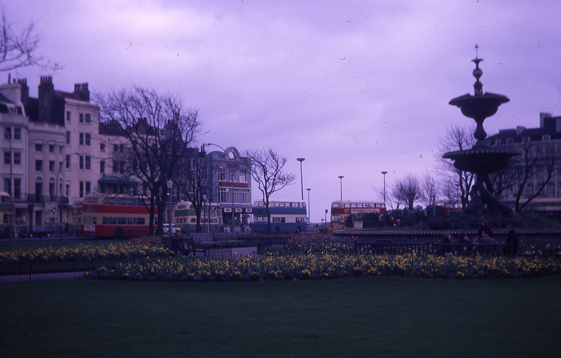 This colourful scene at Old Steine captures all three common Brighton liveries of the time: Southdown's apple green and cream, Brighton, Hove & District's Tilling Red and cream with Brighton's French blue and white.