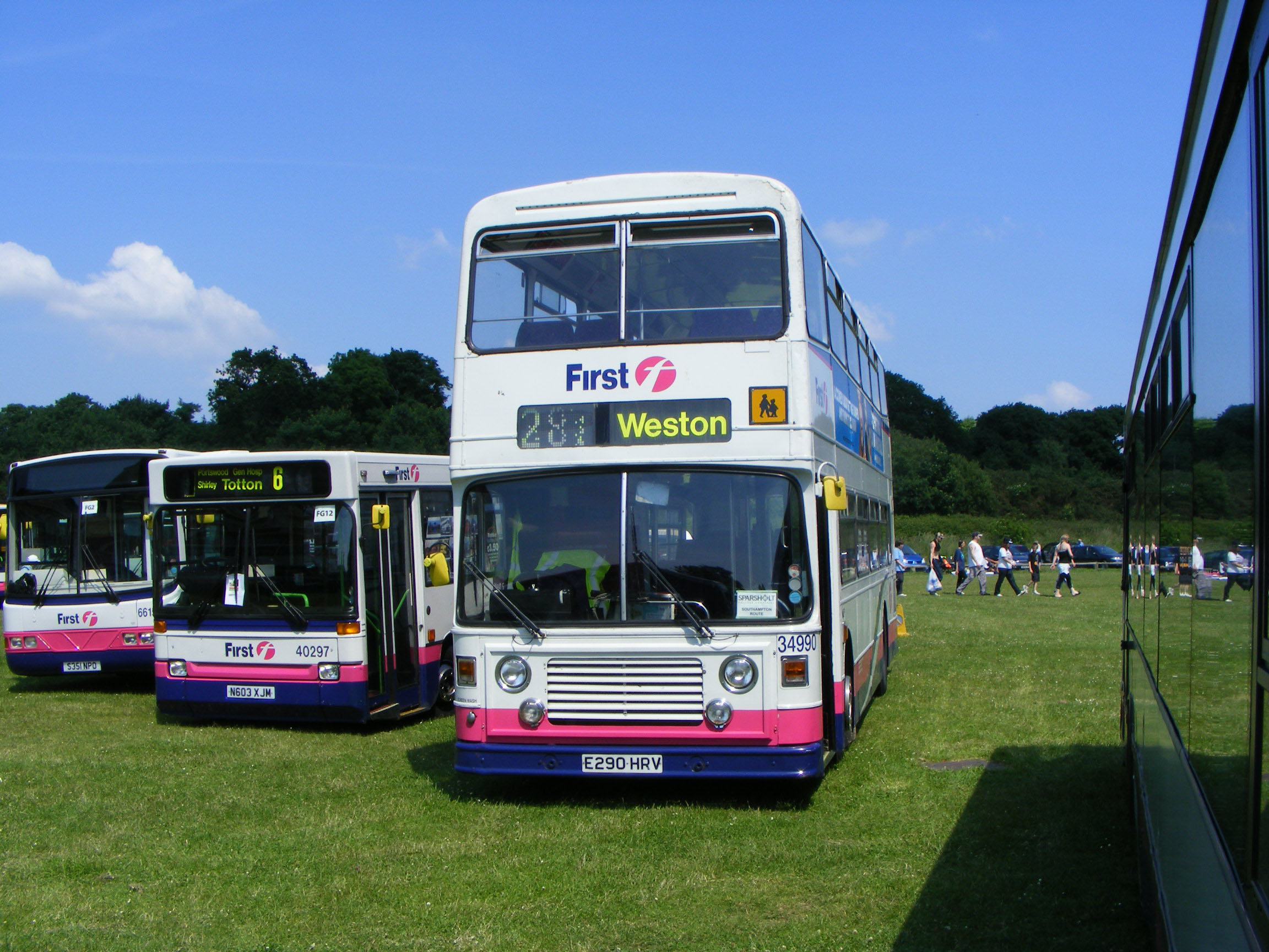 Nearly 21 years old, 34990 (E290HRV) was a coach seated East Lancs Leyland Olympian new to Southampton City Transport in 1987. It had made it into First corporate colours and is here seen in the display at Netley Park in summer 2008. Alongside is a split step-entrance Dart new to Q-Drive (Beeline).