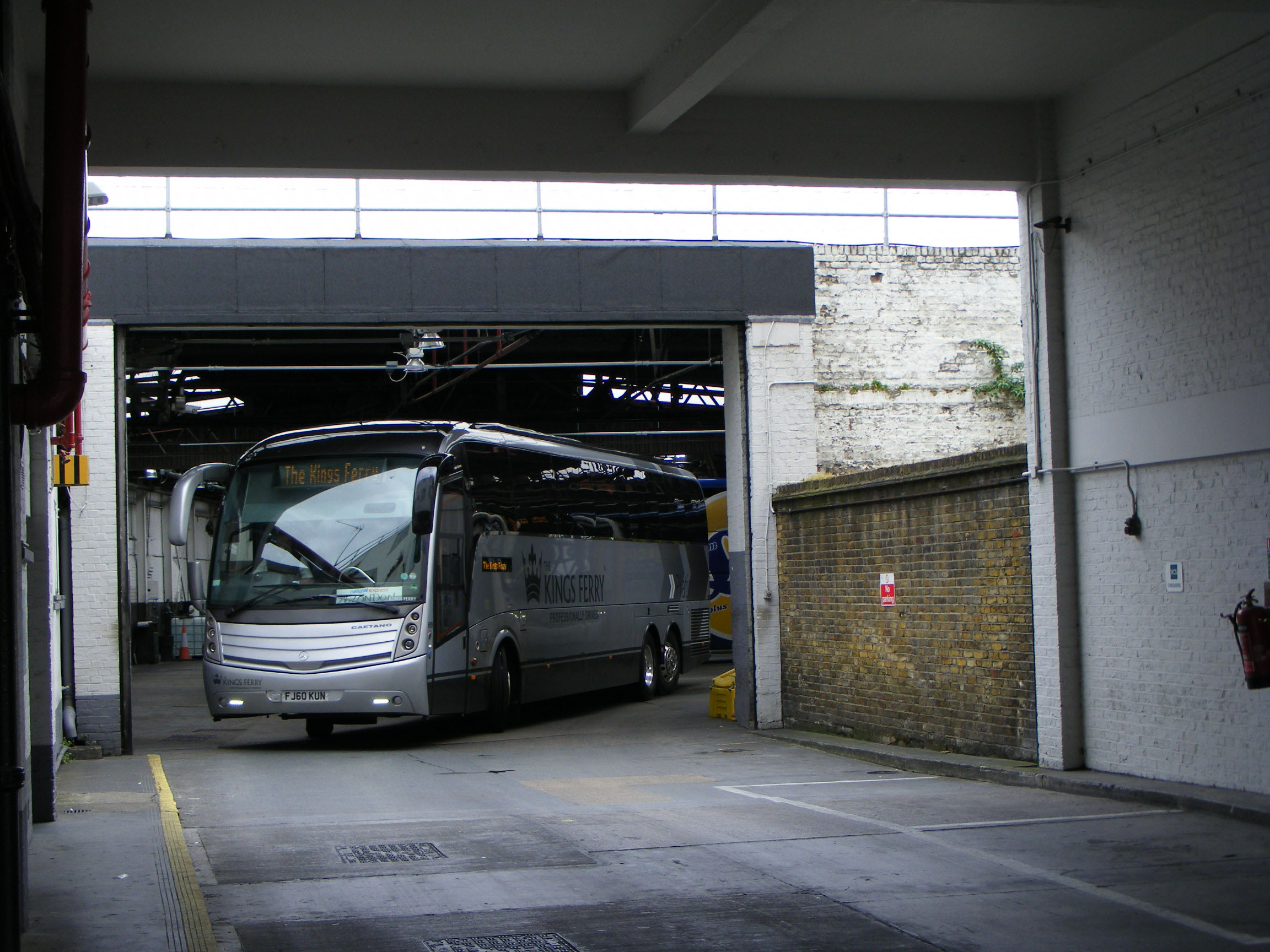 The Caetano Levante body in the UK was built exclusively for National Express and its contractors on Scania and, later, Volvo chassis. Taking advantage of group membership The Kings Ferry took delivery of a batch on Mercedes OC500RF chassis like 6.19 (FU60KUN), seen here emerging from "Sammy's Garage", Victoria Coach Station in May 2013, having worked a National Express run. |