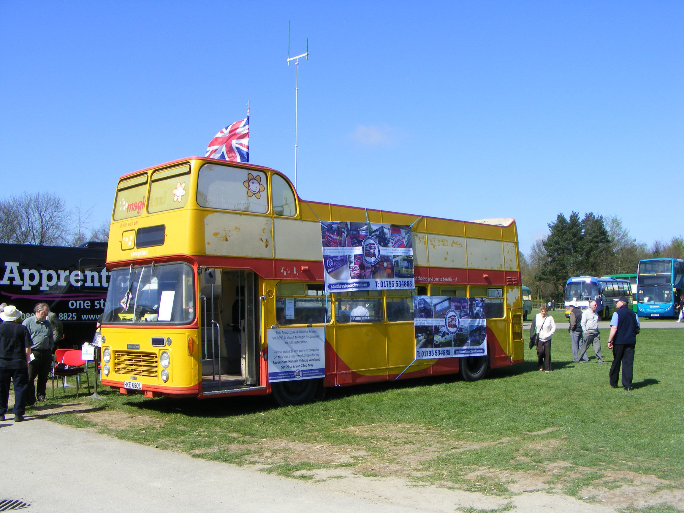 Former M&D 1959 lowbridge Atlantean L44 (44DKT) served with Orpington & District, the fledging fleet that metamorphised into Go-Ahead's Metrobus subsidiary. Their pioneering 853 route needed a lowbridge bus, but they also utilised minibuses. The bus is seen at twilight. |