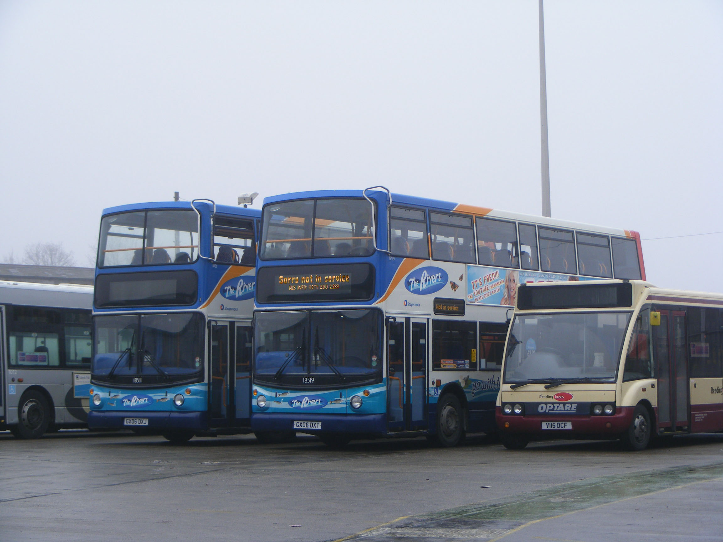 Seen resting in Reading Buses depot in December 2010 was this pair of "The Rivers" branded Tridents, 18511 (GX06DXJ) and 18519 (GX06DXT). They wre taking a break from Reading Blockade rail replacement duties alongside Reading Buses Optare Solo 115 (V115DCF). |