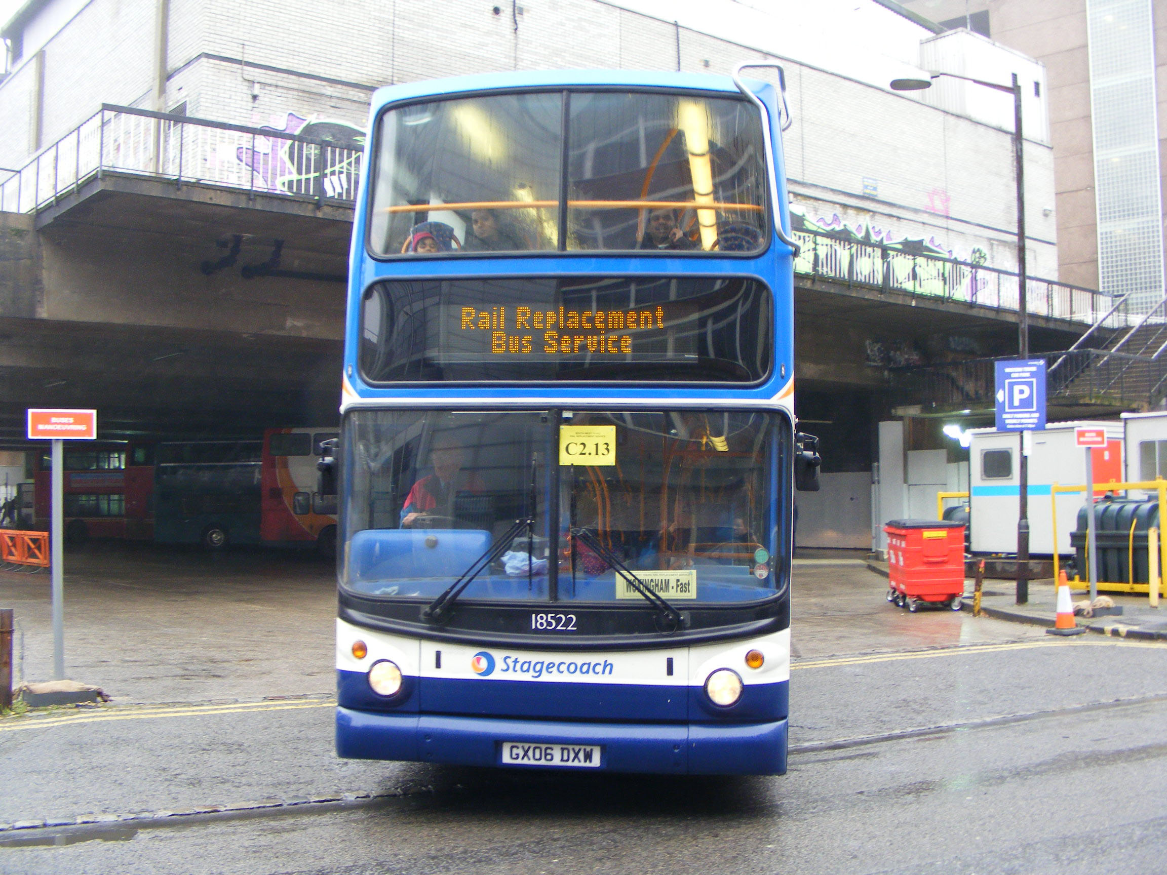 Emerging from the mothballed former Thames Valley Reading Bus Station on rail replacement duties associated with the Reading Blockade over Christmas 2010 is yet another of the 2006 Alexander Dennis Trident ALX400 batch, 18522 (GX06DXW). |