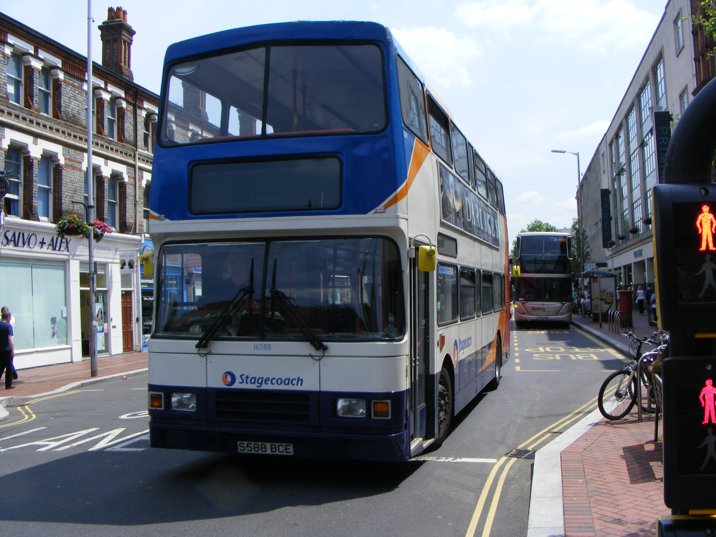 Arriving in Reading in July 2013 is Alexander bodied Volvo Olympian 16588 (S588BCE), the bus was new with coach seating to Viscount in Peterborough.