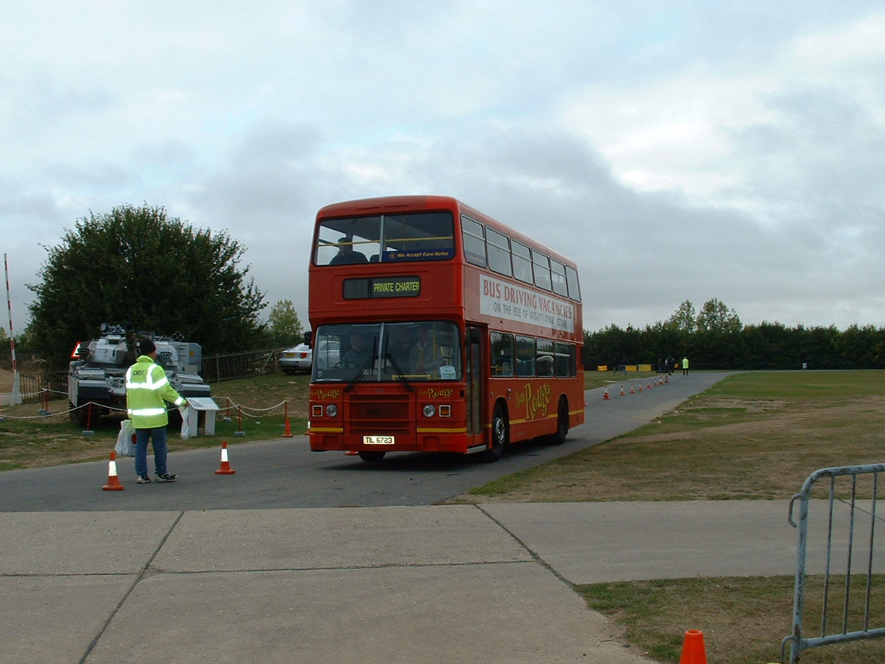 Leaving SHOWBUS international 2004 is Route Rouge Northern Counties bodied Volvo Olympian 751 (M751HDL) in company with a former PMT Ford Transit 161 (C161VRE). |