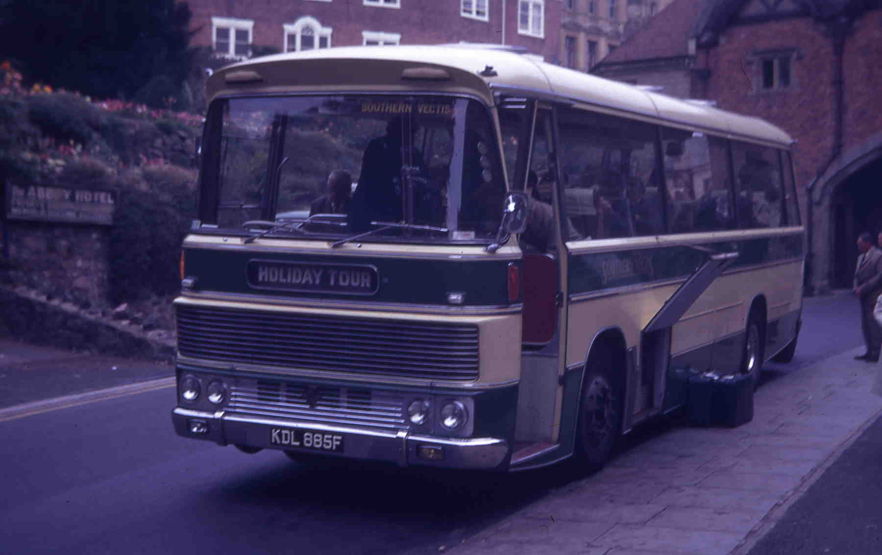 In sharp contast to 103 above, and seen outside the Abbey Hotel in Great Malvern in summer 1971, is three year old 301 (KDL885F). This rare vehicle is a Duple Commander bodied short Bristol RESH6G coach with only 39 seats. The Hotel was a regular location for coach parties to overnight whilst on various tours and the likes of Midland Red and Greenslades were regulars but Southern Vectis was not.