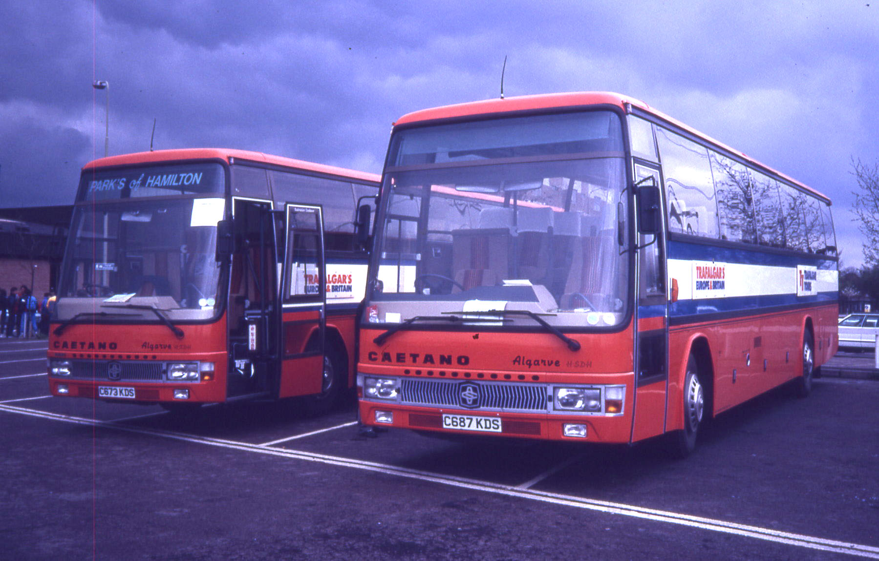 This pair of Caetano Algarve bodied Volvo B10M coaches, C673/87KDS, are seen together in Trafalgar livery when quite new. They were part of a huge delivery new in 1986.