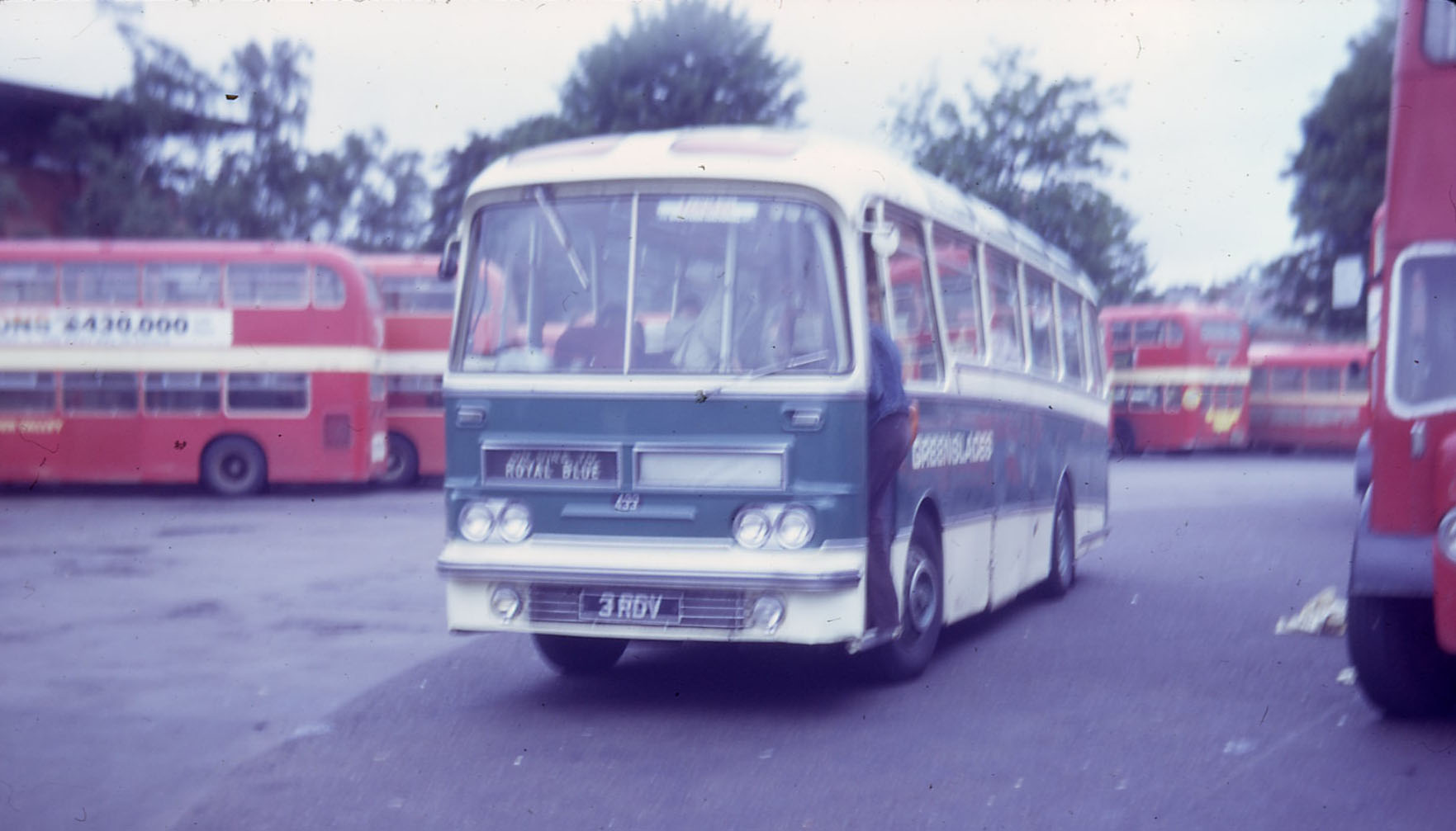 This Cavalier was new to Devon General's Grey Cars fleet in 1964 a 3 (3RDV). With the establishment of the National Bus Company and consequent reorganisation, the Grey Car operations were merged with Greenslades. Fleets across the west - Bristol Greyhound, Royal Blue, Red & White, Black & White amongst them - adopted a new unified white livery each with an individual colour band with Macrogamma Bold fleetnames, all a prelude to the National Express identity. Greenslades got turquoise as its colour and 3RDV, now numbered 433, is seen in Maidenhead Bus Station in 1974 on a Royal Blue working. |