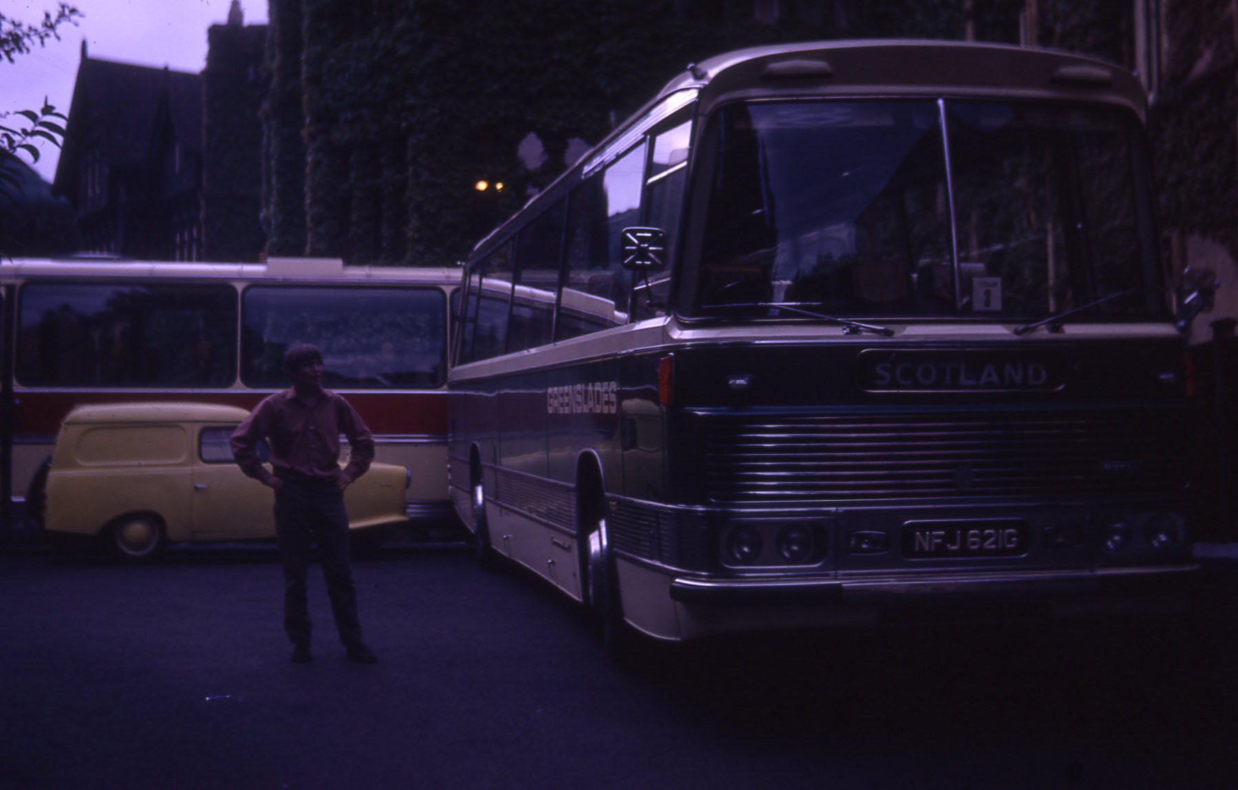 Amongst the last coaches ordered without undue corporate interference was NFJ621G, the middle of a batch of five delievered in 1969. By then Brighton based Harringtons had passed into history so bodies from Blackpool based Duple (Northern) were ordered. The coach is also at Malvern's Abbey Hotel in 1971 on a Scottish tour. |