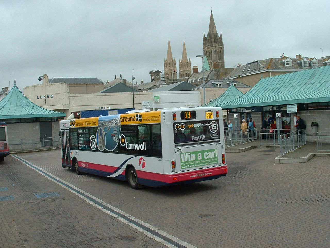 Dart 42937 (SN05DZT) is another in 14/18 livery negotiating the narrow streets leading to the cramped Truro Bus Station.