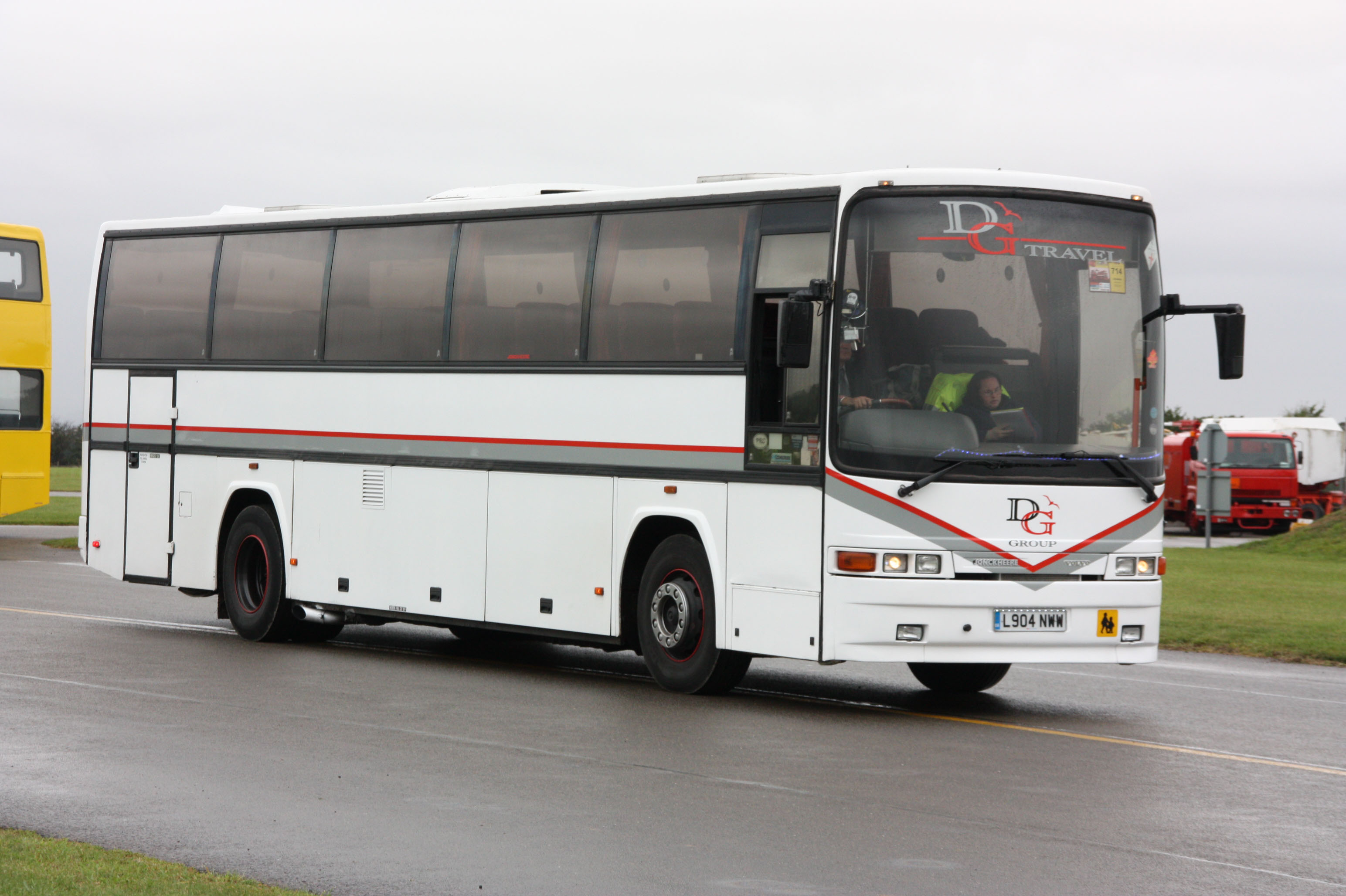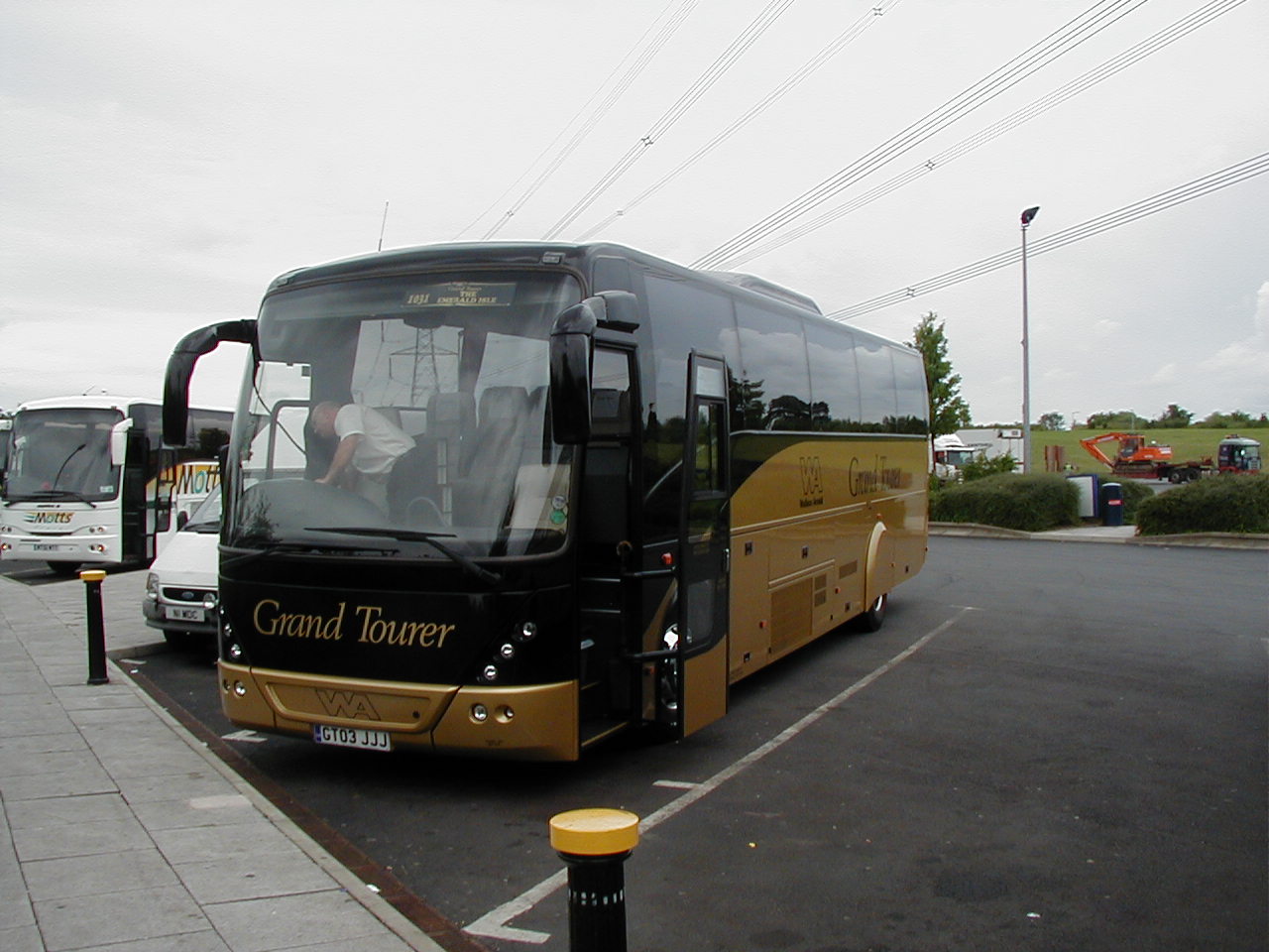 Wallace Arnold introduced an up market "Grand Tourer" branding using a fleet of black and gold Volvo B12M with Jonckheere bodywork complete with spats over the rear wheel arches. Most appropriately they entered the most appropriately registered GT02BUZ in the Golden Jubilee commemorative Gold Run at SHOWBUS in 2002. The coach is seen at Duxford resting after the Run with Golden Jubilee liveried MK Metro Solo 20 (V82EVU). |