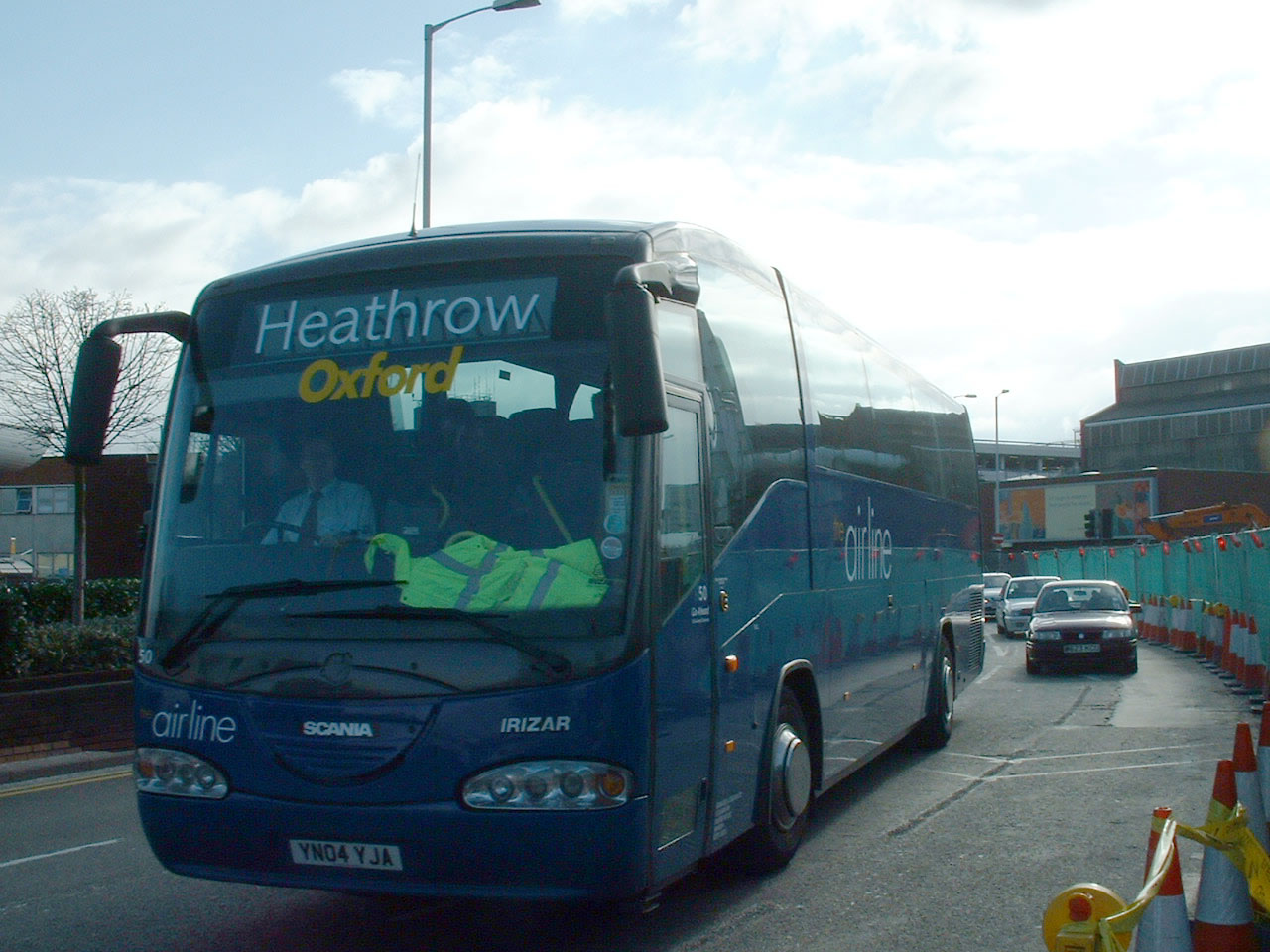 Quite why this semi-liveried Irizar Century bodied Scania K114EB, YN04YJA, was in service at Heathrow in February 2005 is unclear, especially as it is carrying the fleet number, 50, of Irizar M1OXF. Possibly the latter was undergoing major repairs or warranty work so the Scania demonstrator was providing a replacement. |