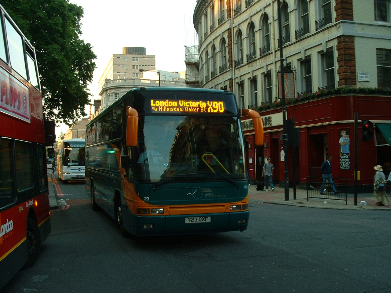 The same coach is seen speeding to London on the M40 at Handy Cross, High Wycombe. In common with the rest of the Espress Excaliburs, the coach was previously in blue livery on the airline route. de Courcey Travel fleet acquired 23 later. |