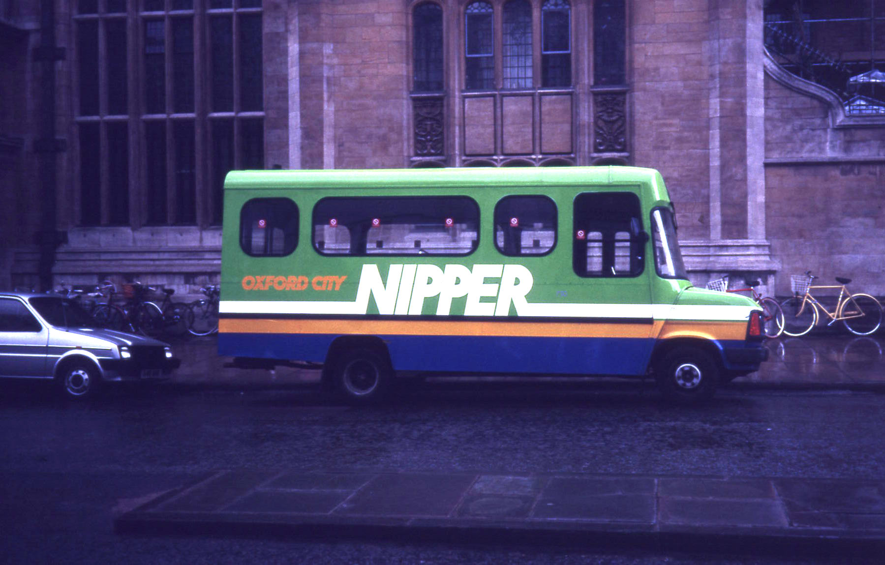 Here one of Oxford's Nippers is seen in service in the city. These Transits were different from most NBC vehicles in being long wheel base 20-seaters rather than the standard sixteen. |