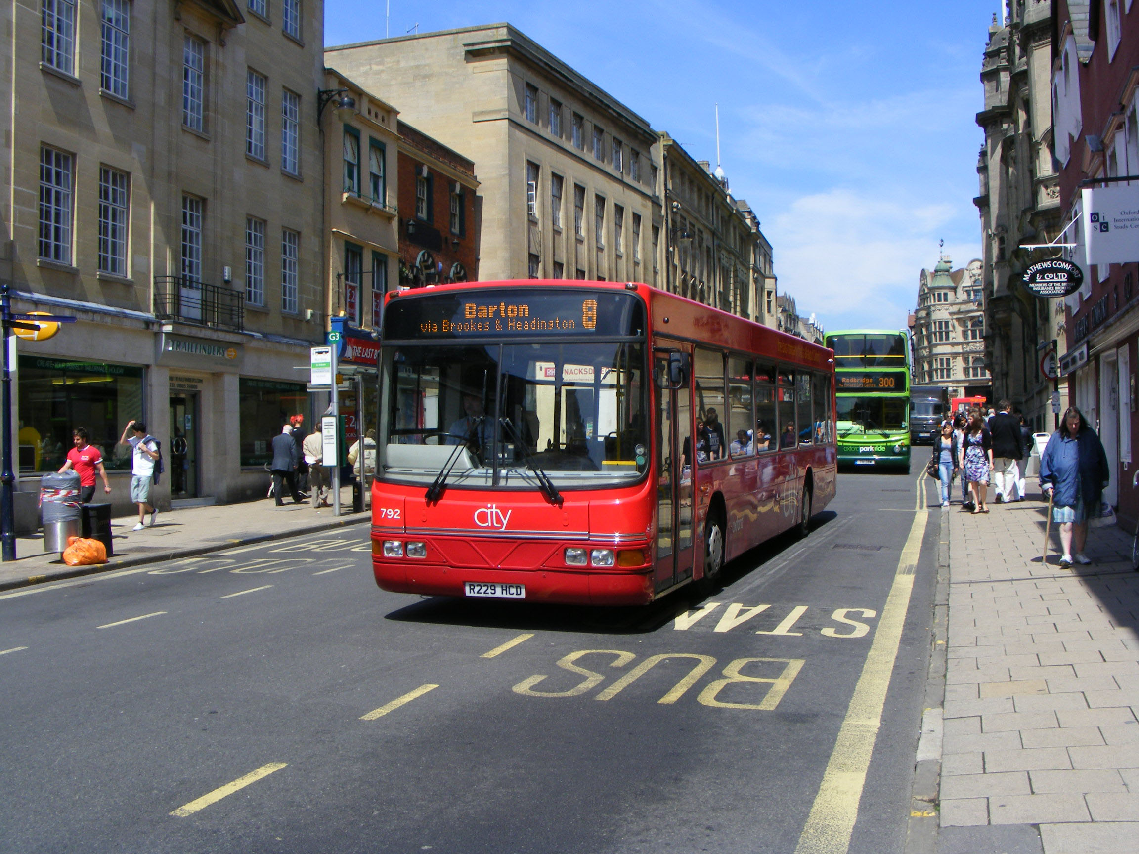 For some reason ex Brighton & Hove 229 (R229HCD) became 792 rather than 799. The Volvo is seen in St Aldates followed by a Park & Ride Trident in June 2010. |