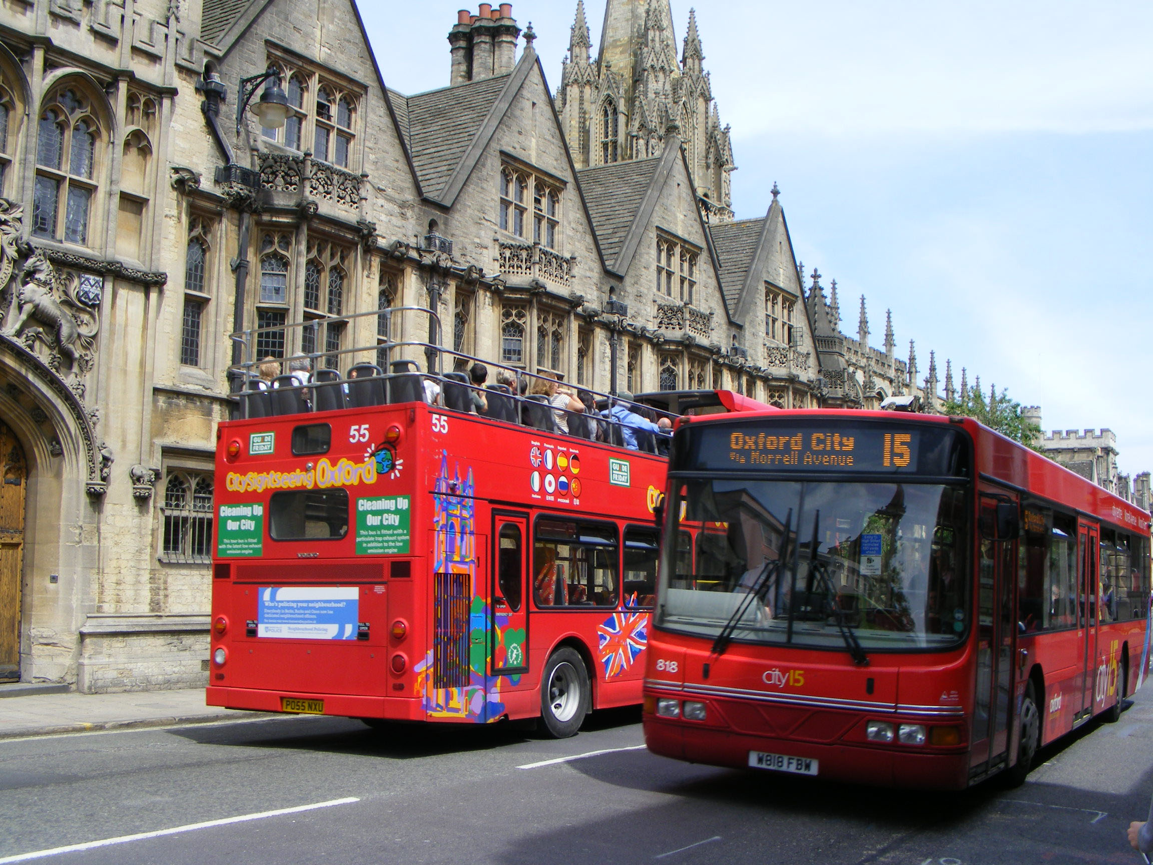 Another route 15 branded Volvo B10BLE, 818 (W818FBW), passes one of City Sightseeing's open toppers in St Aldates in May 2008. |
