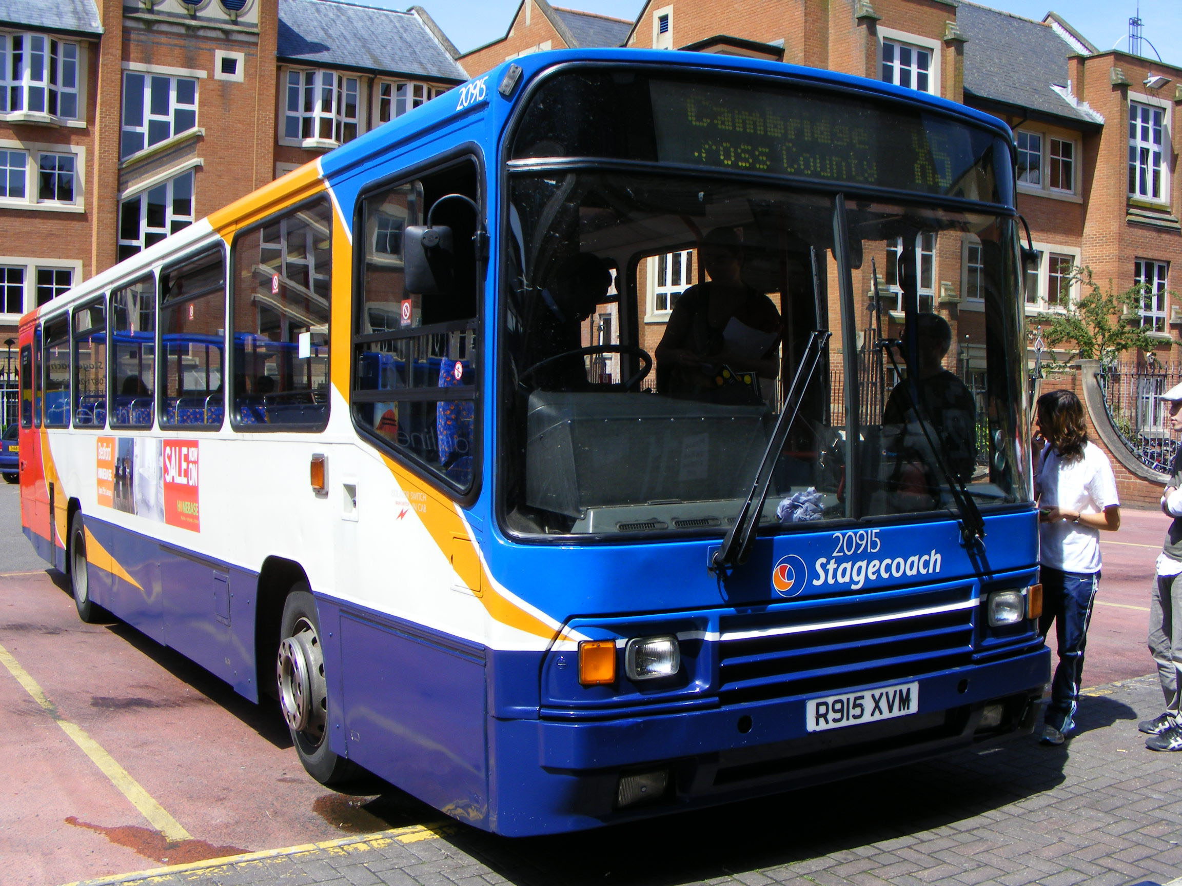 Volvo B10M 20915 (R915XVM) is seen in Gloucester Green Bus Station in May 2008. The Alewxander PS bodied bus is about to head off on the long distance X5 to Cambridge. The Stagecoach standard bus was new to Stagecoach Manchester. TYhe X5 service was given the Stagecoach treatment and the old B10M buses were replaced by wifi equipped Plaxton bodied coaches on an enhanced frequency,