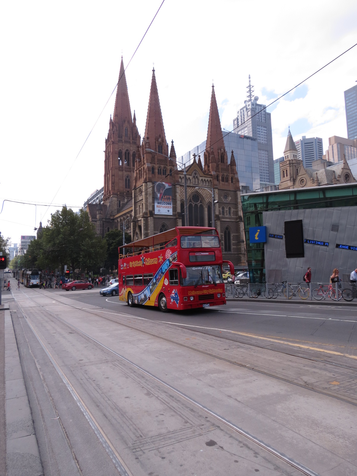 Its day's work over, Giuseppe departs Federation Square and heads home one evening late in March 2014 with Melbourne Cathedral as a back drop.
