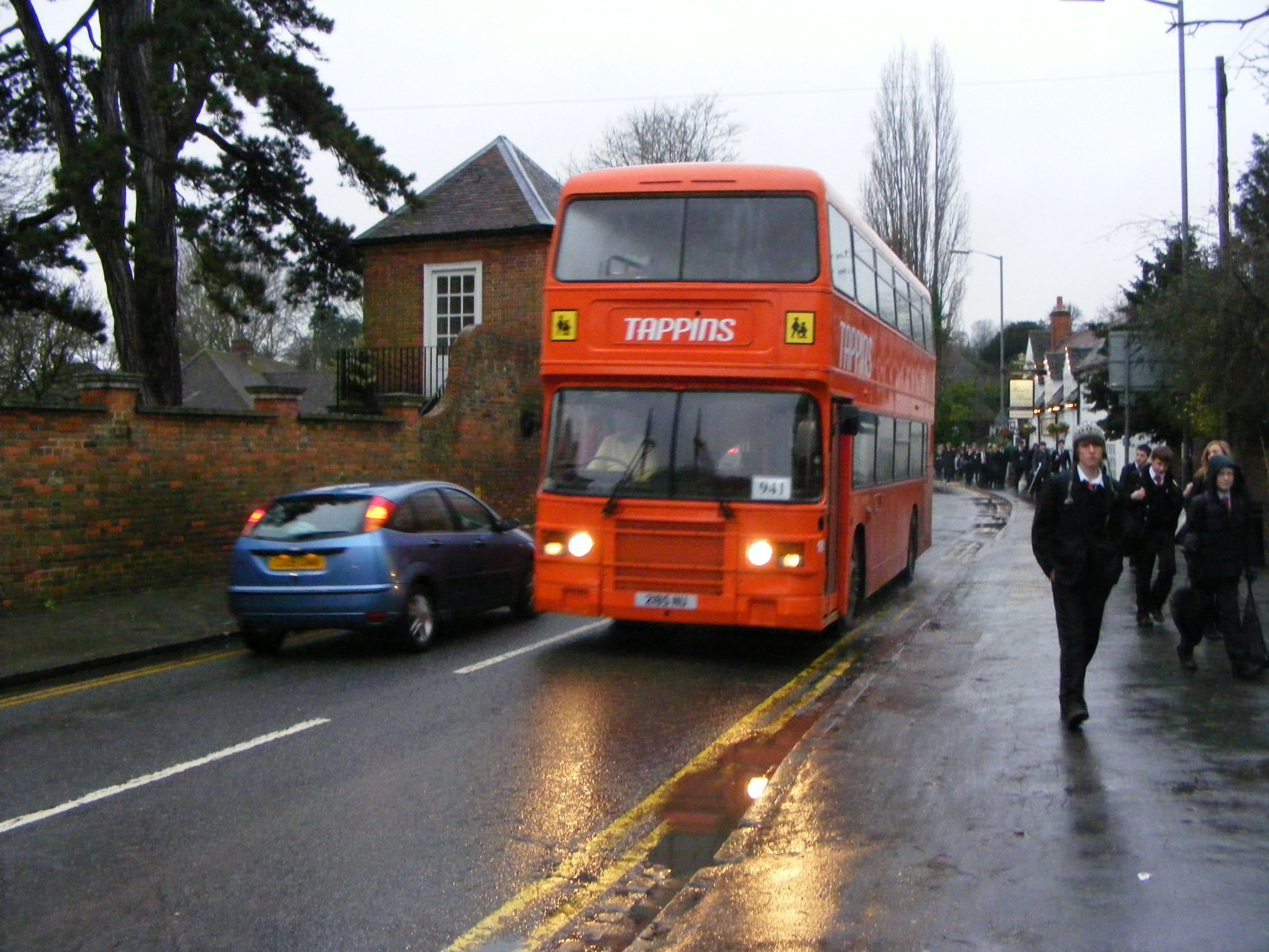 | Bought from United by Heyfordian to join their school bus fleet, the bus retained the Arriva blue livery it arrived in, which was adopted for other school buses too. The bus was later allocated to Tappins and repainted in their livery. It is seen here on a wet January 2009 morning outside Sir William Borlase's Grammar School in Marlow having just operated the daily Heyfordian school run to Borlase. The bus was originally United 246 (B246NVN) but had been given Heyfordian cherished plate 2185NU, later transferred to one of their Optare Solos. |