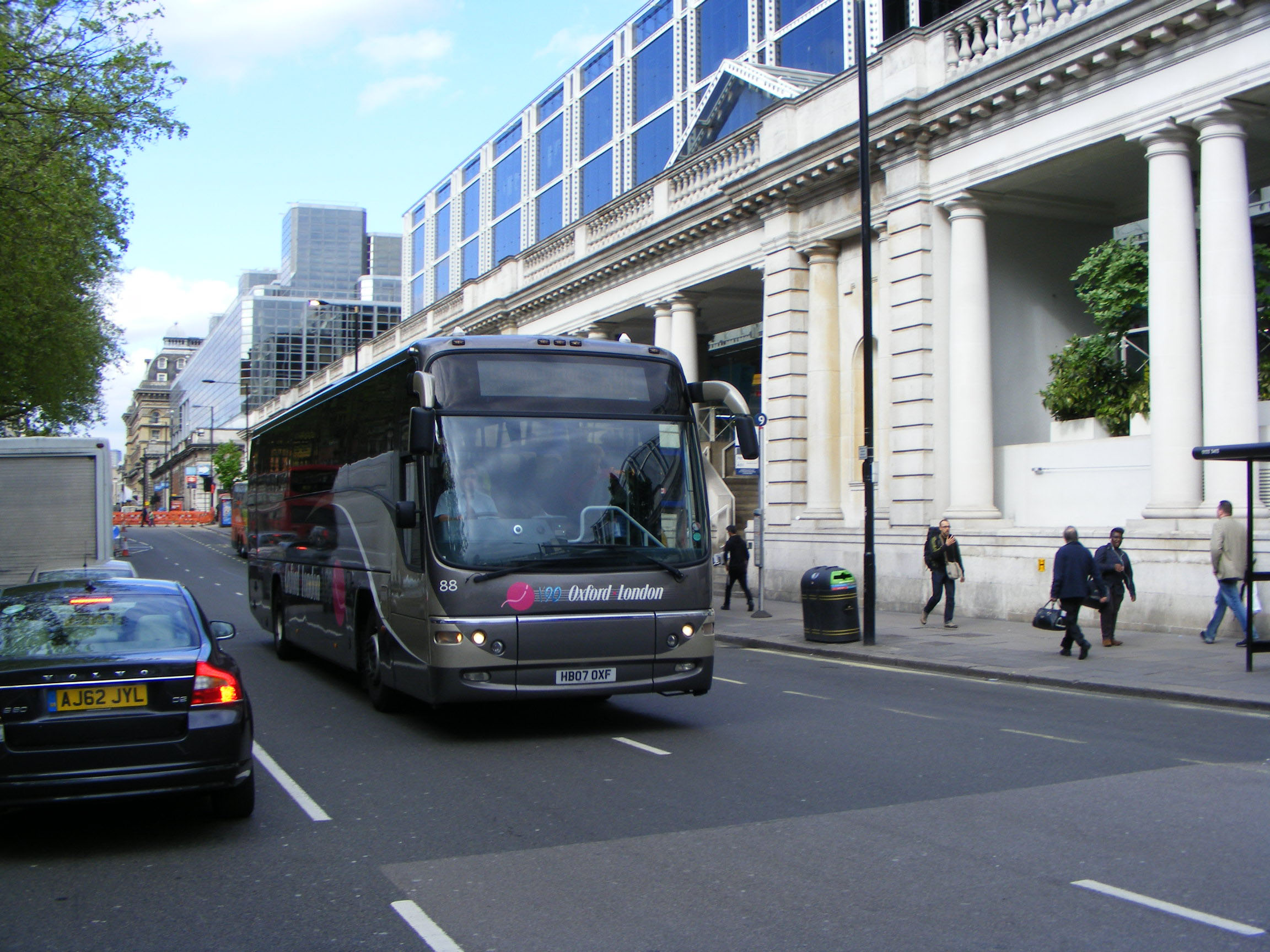 In 2012 the Oxford Espress was rebranded as the X90, the green and orange livery giving way to a grey and beige scheme. Heading from the city in May that year was 95 (EE08OXF), a former Airline Plaxton Panther bodied Volvo B12B coaches rebranded for the X90.