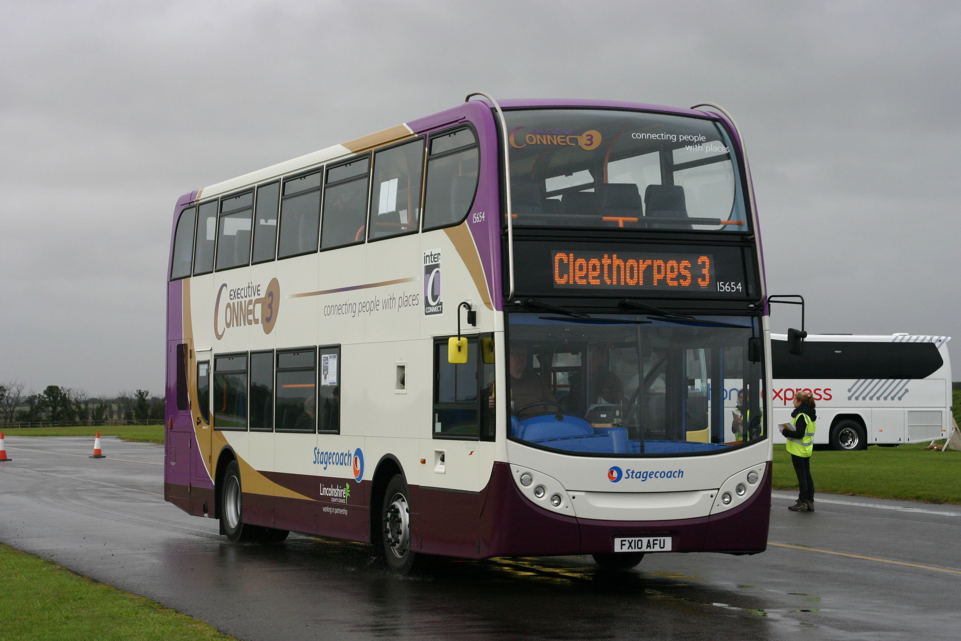 Maintaining the tradition of specially liveried buses attending SHOWBUS, this Alexander Dennis Enviro400 bodied Scania N230UD is seen arriving in 2010 in another Connect services livery, which seems to have been inspired by Stagecoach's royal Golden Jubilee scheme of 2002. This is 15654 (FX10AFU).